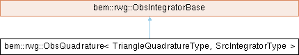 Inheritance diagram for bem::rwg::ObsQuadrature< TriangleQuadratureType, SrcIntegratorType >:Class for quadrature over the observation triangle for RWG-based BEM operators. Reference: O. Ergul, L. Gurel, "The Multilevel Fast Multipole Algorithm (MLFMA) for Solving Large-Scale Computational Electromagnetics Problems," book, Wiley-IEEE Press, 2014.