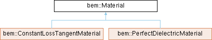 Inheritance diagram for bem::Material:Class defining a general material with a constant (zero or non-zero) electrical conductivity and real or complex permittivity and permeability.