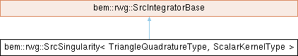 Inheritance diagram for bem::rwg::SrcSingularity< TriangleQuadratureType, ScalarKernelType >:Class for 2D quadrature over the source triangle with singularity treatment for RWG-based BEM operators. Reference: