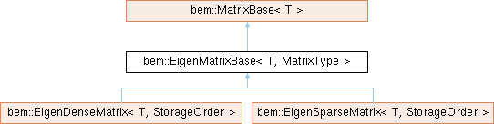 Inheritance diagram for bem::EigenMatrixBase< T, MatrixType >:Base class for Eigen-based matrices.