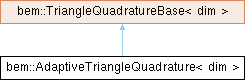 Inheritance diagram for bem::AdaptiveTriangleQuadrature< dim >:Class for adaptive quadrature over a triangle. Reference: O. Ergul, L. Gurel, "The Multilevel Fast Multipole Algorithm (MLFMA) for Solving Large-Scale Computational Electromagnetics Problems," book, Wiley-IEEE Press, 2014.